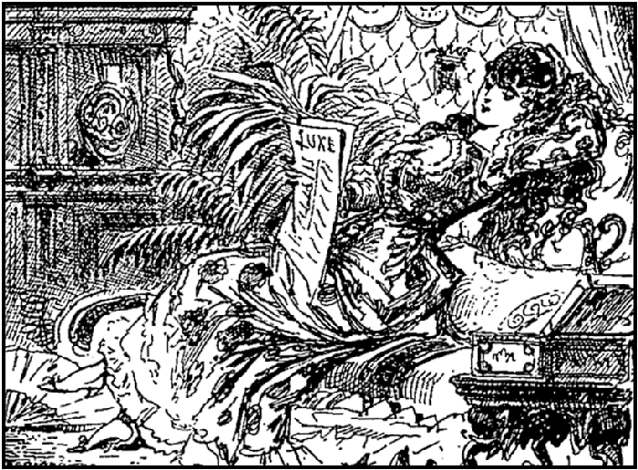 Madame s'ennuie dans sa chambre à coucher et s'impatiente en voyant la pendule, qui lui semble marcher à rebours. Elle caresse son beau lévrier et regarde par la fenêtre. Mais il ne vient pas!
