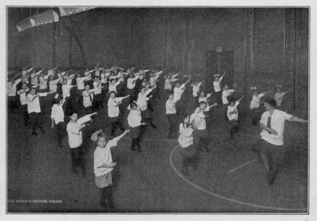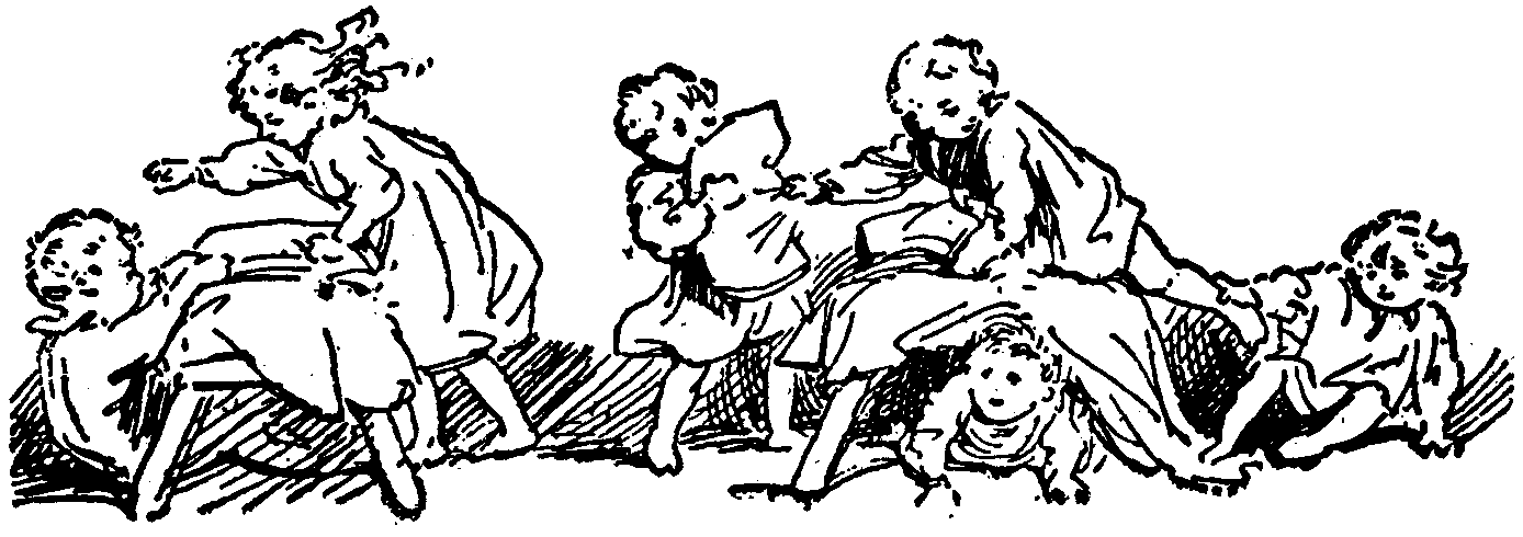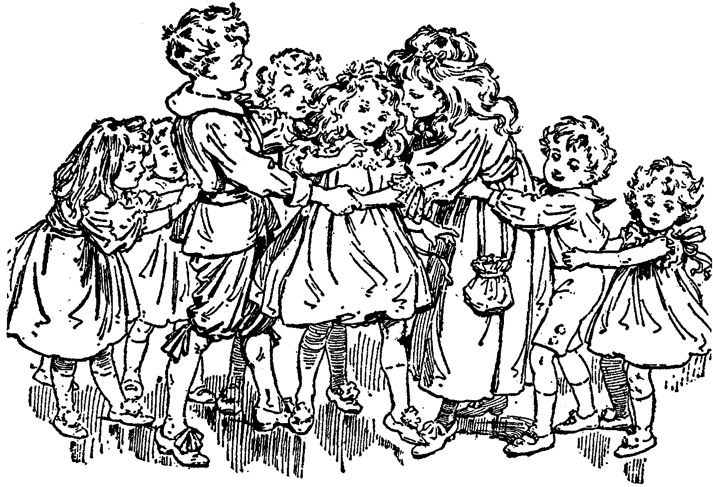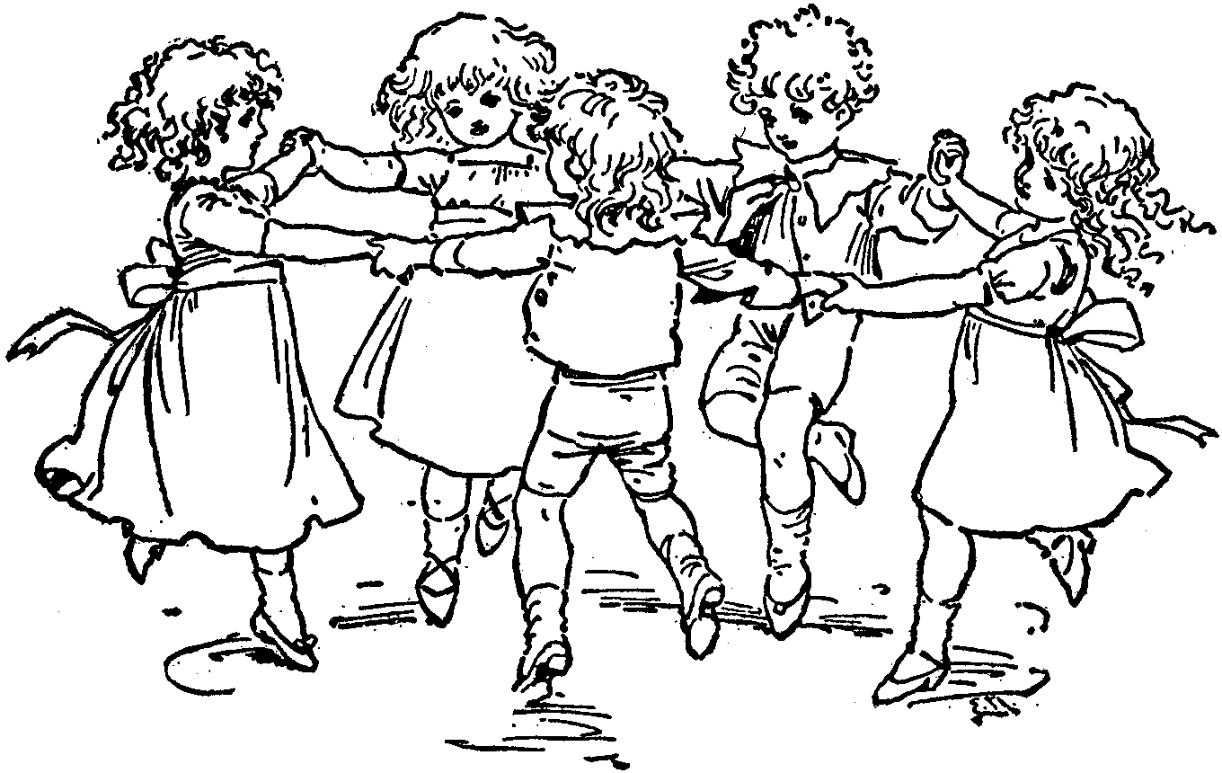 3. When leader reaches center of spiral, tight wound, she signals [pg 109] to players in some direction and they lift arms, forming arches, under which the line may pass, teacher leading, hands are kept grasped in this case.