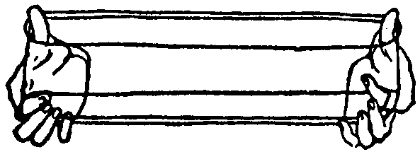 Now hold the elastic between the thumb and first finger of each hand and twirl it round, stretching it a little at the same time. The rapid movement thus caused will make the revolving pin look like a glass object, and if you have a strong light falling on the pin and a dark background behind it, the resemblance becomes very much stronger.