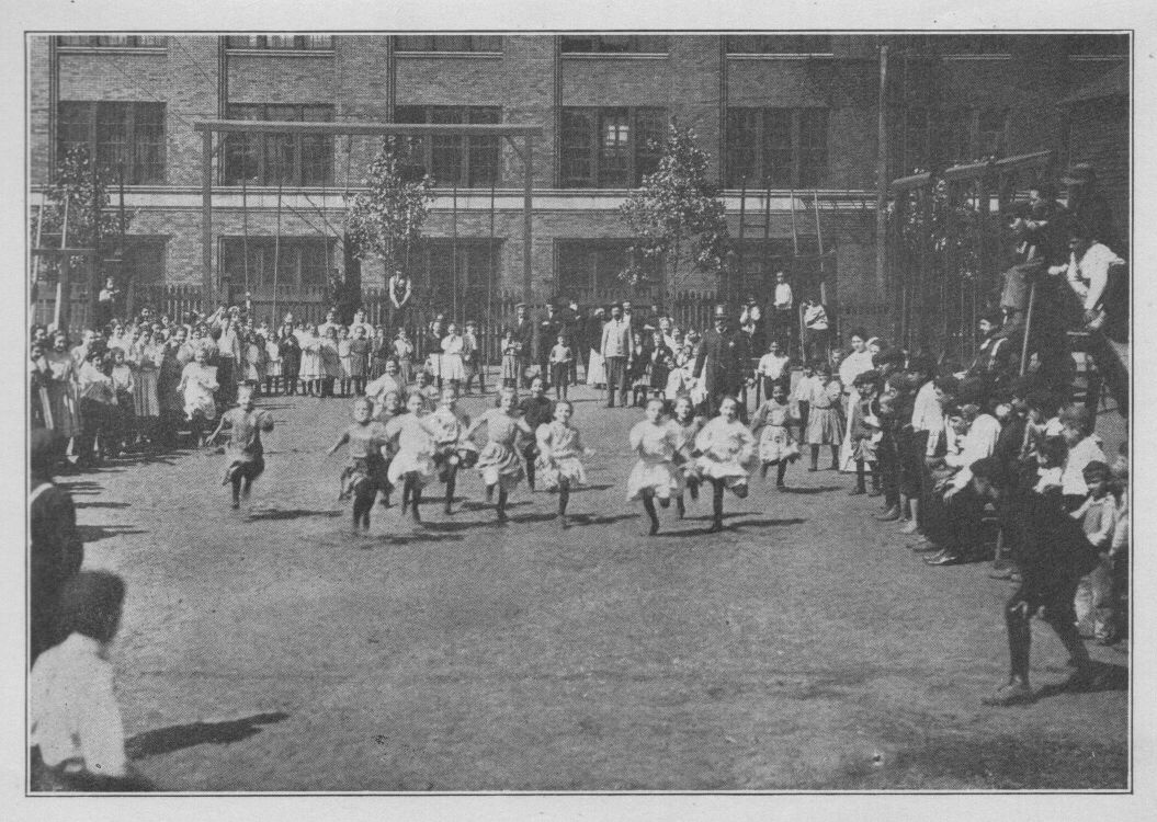This is like "Racing" (See First Grade), but more continuous. Two or more rows compete. The player in the back seat rises at a signal from the teacher, runs forward down the aisle, tags the wall at the front of the room, and returns to his seat. As soon as he has reached his seat the player next in front of him does the same, the relay being complete when each player in turn has run. The line whose front player is seated first wins.