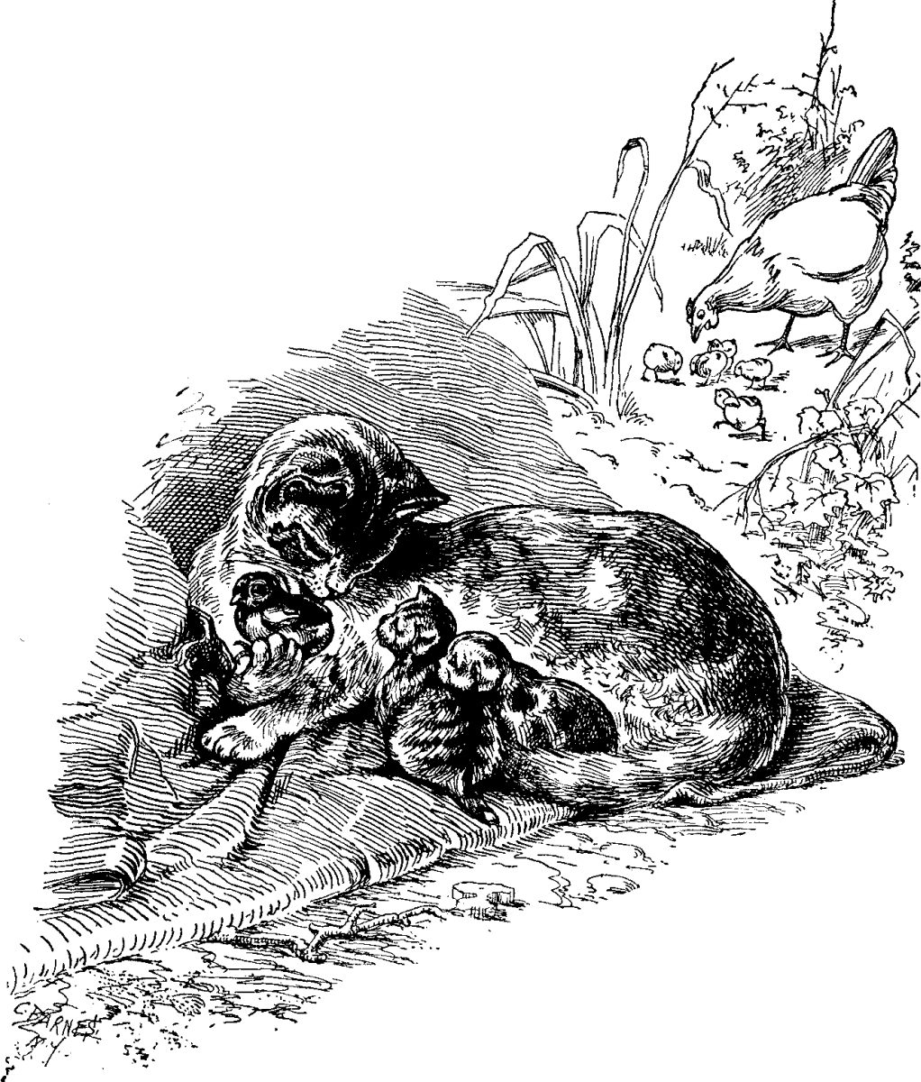 And Juno took the chicken and held it with one paw while she licked it all over, though I am not sure that she liked the taste of the soft down that covered the little stranger. She kept the chicken all that night and every night afterwards until it considered itself big enough to go alone.