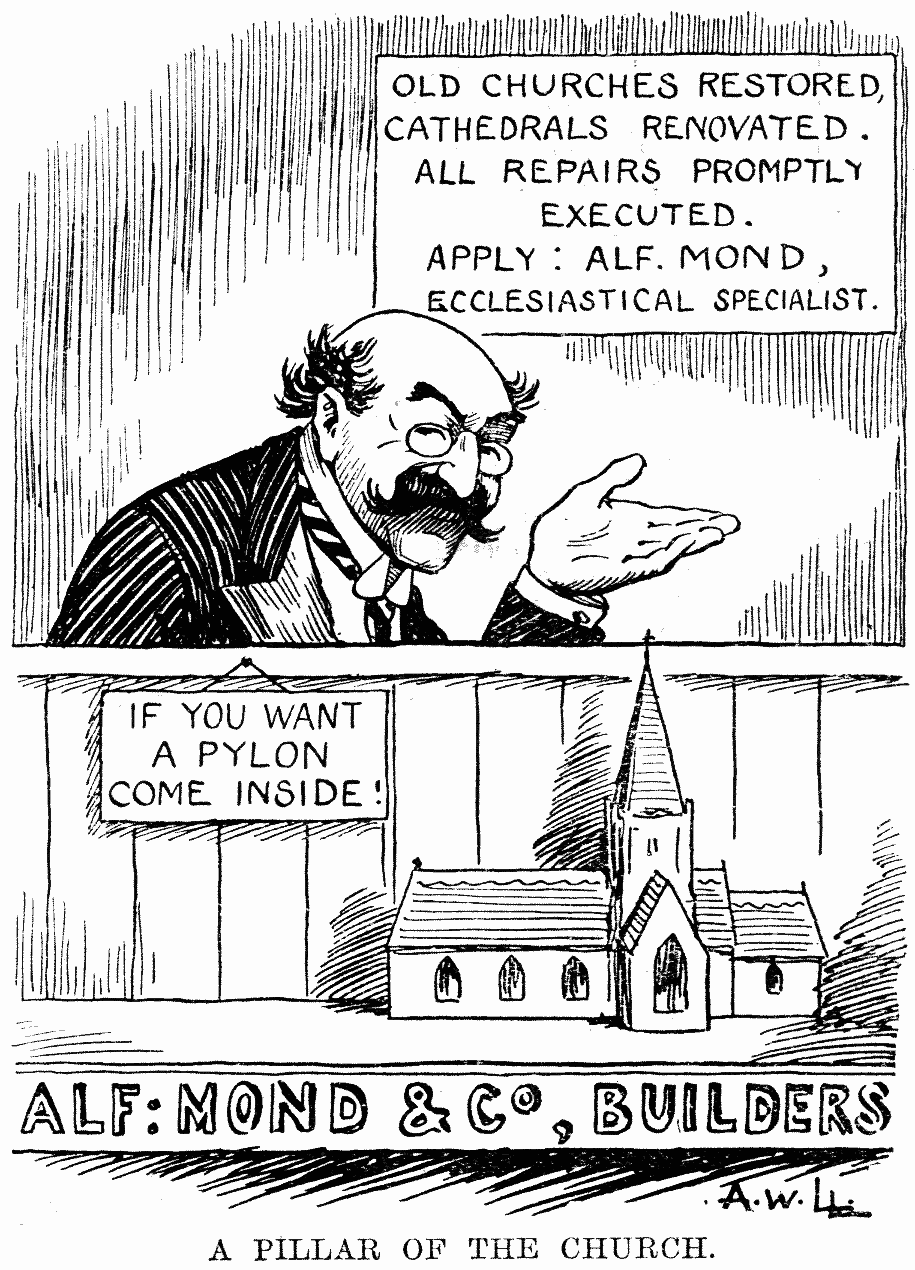 I had hoped that the War was going to reform ideas on dress and make things more simple for those whose trouser-knees go baggy so soon and remain thus for so long; but, like too many of the expectations which we used to foster, this also has failed. It is therefore the benign couple who must carry on the good work. Let them, if they really love their fellow-creatures, go to a wedding or two (having previously given a present of sufficient value to ensure respect) and display their careless garb among the guests, and then in a little while old garments would at these exacting functions become as fashionable as new and we should all be happier.