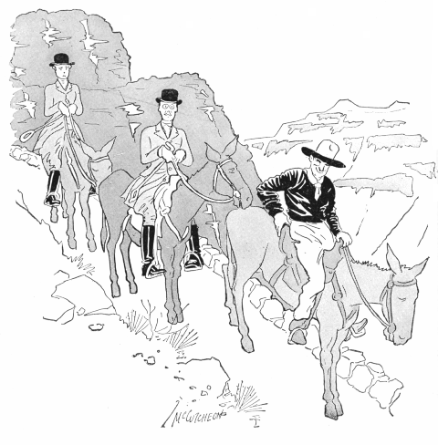Having seen the cañon—or a little bit of it—from the top, the next thing to do is to go down into it and view it from the sides and the bottom. Most of the visitors follow the Bright Angel Trail which is handily near by and has an assuring name. There are only two ways to do the inside of the Grand Cañon—afoot and on mule-back. El Tovar hotel provides the necessary regalia, if you have not come prepared—divided skirts for the women and leggings for the men, a mule apiece and a guide to every party of six or eight.