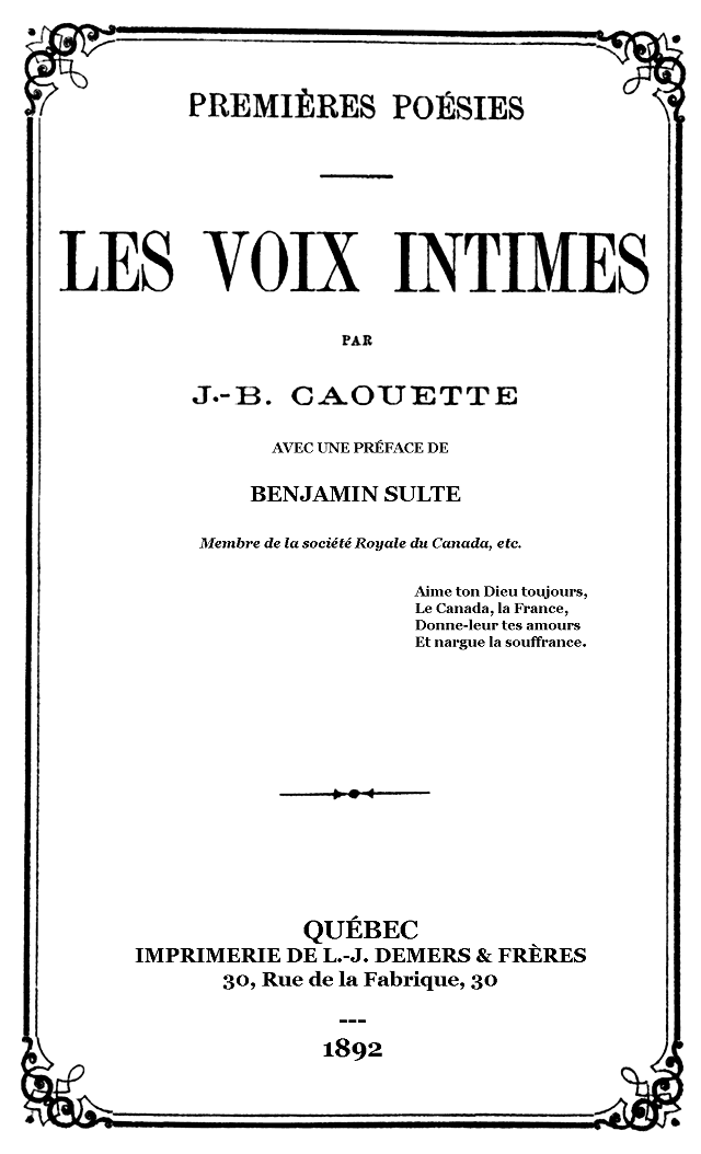 Maintenant les jeunes se recommandent à nous: faisons aux autres ce que l'on n'a pu faire pour nous. M. J.-B. Caouette est un débutant que je vous présente parce que ayant fait la connaissance de ses vers, je les trouve de bonne compagnie. Vous pourrez les lire sans vous compromettre. C'est un bon Canadien de plus dans notre cercle, et si, un jour, il nous échappe pour passer à la postérité, vous ne serez ni inquiets sur son compte ni gênés de l'avoir connu. Pour le moment, ce travailleur est au moins estimable; saluons son arrivée sur la scène.