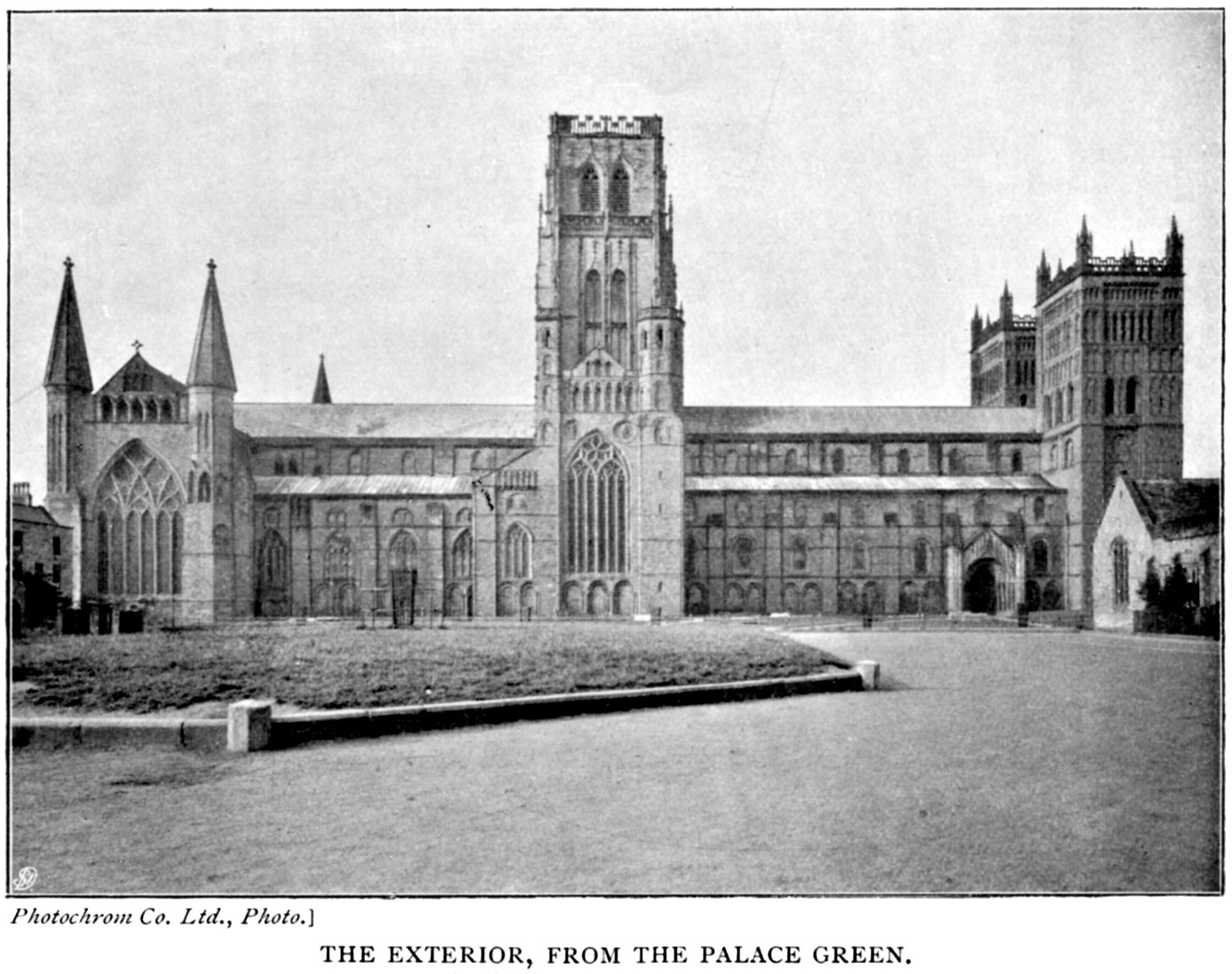 Approaching the Cathedral Church of Durham from the north by the large open space between it and the Castle, known as the Palace Green, we obtain a complete elevation of the whole structure. There is little room to doubt, though the details naturally vary with the date of erection, that the original plan of Carileph's church has been carried out in its entirety, with two exceptions. These are the addition of the eastern transept or nine altar chapel at the east, and the Galilee or Lady Chapel at the west end. The entire length of the building, not including the Galilee chapel, is 431 feet, which is made up as follows:—Nine altar chapel 51 feet, the choir 120 feet, the transept 57 feet, and the nave 203 feet.