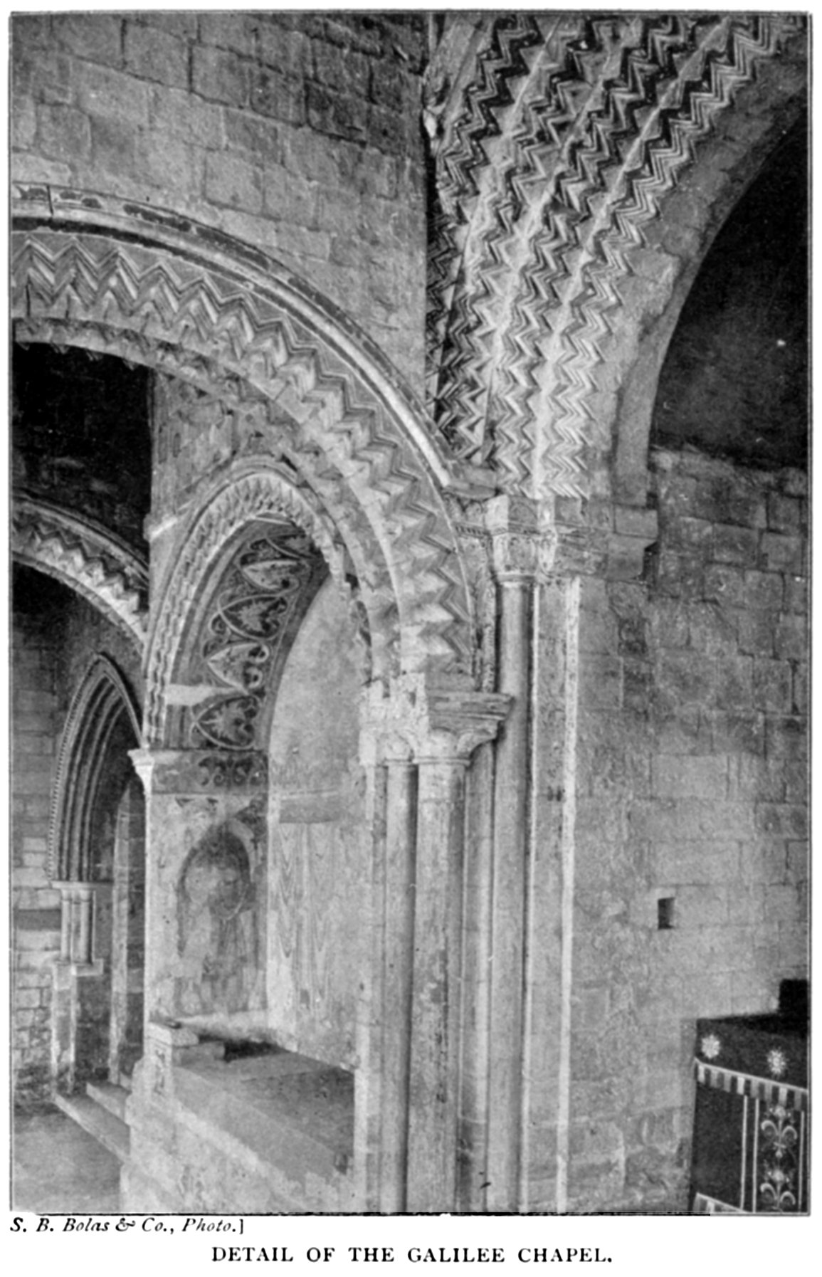 The Western Doorway.—The exterior of this great doorway is now within the Galilee chapel. It was built by Flambard (1099-1128), and is comparatively plain. On the Galilee side it consists of an arch of four orders ornamented with chevrons. The inner face is very similar to the outer, but is shallower, having only two orders. The shafts and capitals are without decoration, and the arch ornamented with chevron and a leaf pattern with medallions carved with grotesque animals. In 29 order to reopen this doorway and make a carriage road up to it, Wyatt proposed pulling down the Galilee chapel.
