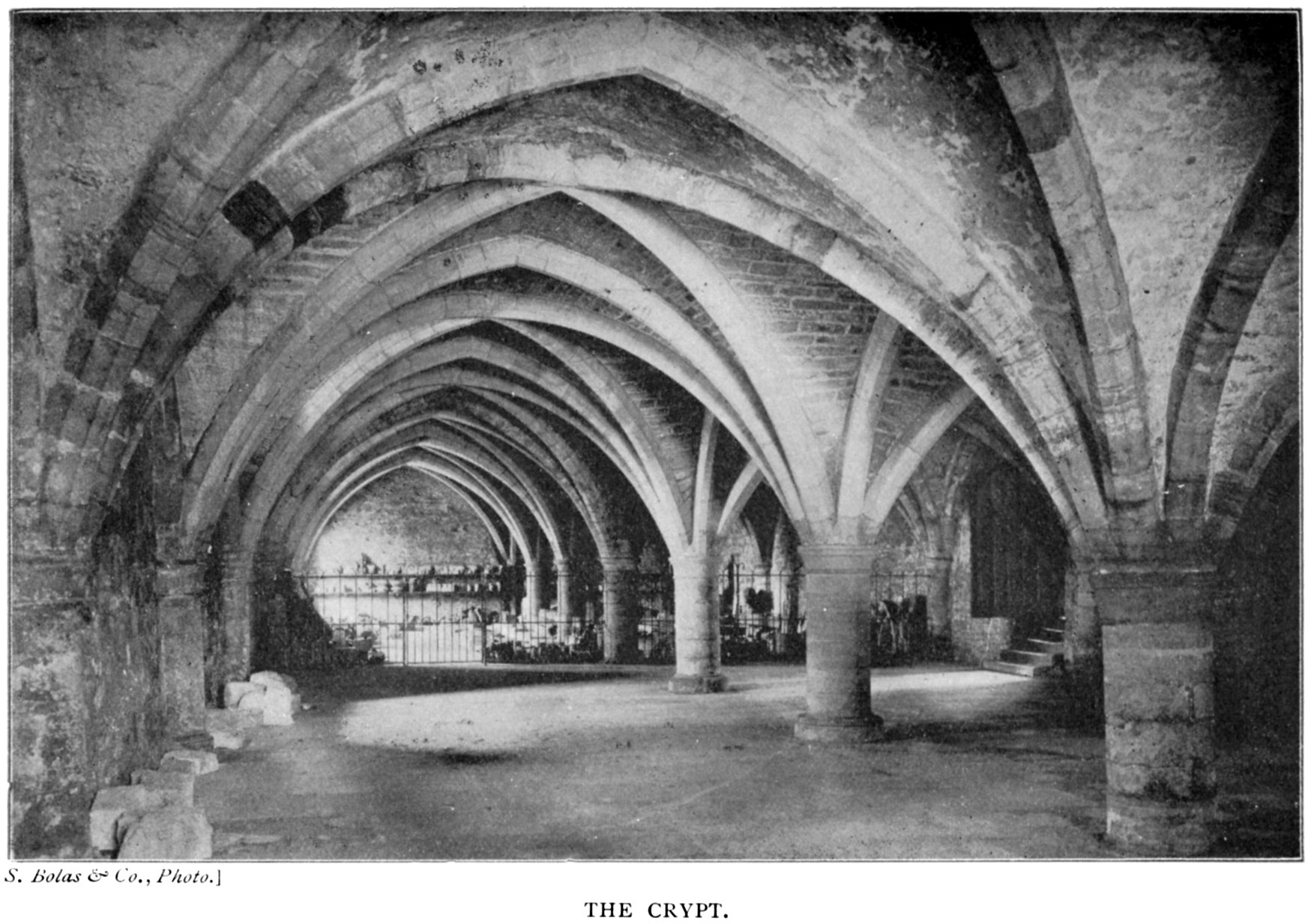 There is no doubt that there was a cloister attached to the monastery in its early days, but of this no trace remains. It is also probable that one was erected by Bishop Pudsey, though this also has entirely vanished, unless (as suggested by Canon Greenwell) some marks of a lean-to roof on the north and east walls may be traces of its presence. In the western alley of the cloister is the old treasury, rich in records, and the vestries for canons, king's scholars, and choristers. The alley opens at the end into what is now called the crypt (see p. 85). This was undoubtedly the common hall of the monks. It is a spacious stone-vaulted chamber. The columns are low and massive, with simple moulded caps, from which the chamfered vaulting ribs diverge. Over the hall or crypt is the dormitory, which for a long time formed part of a residence attached to one of the stalls. It is now, however, used as a library. It occupies the whole of the western side of the cloister, and is 194 feet long. It was originally subdivided, by wooden partitions, into separate sleeping-rooms for each monk. Its massive roof of oak is worthy of attention, the tree trunks being merely roughly squared with an axe (see p. 99).