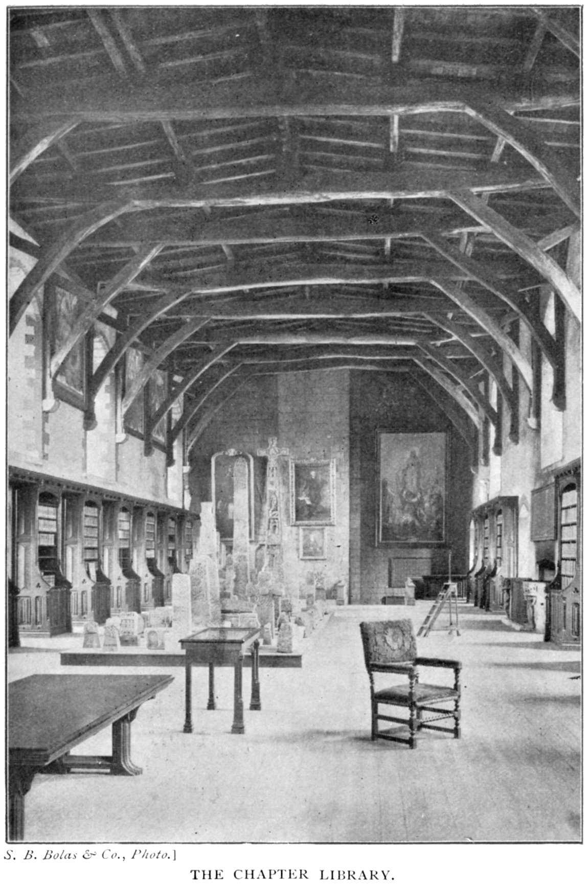 The contents of the library are both numerous and interesting. There are several thousands of volumes, many of them being rare and valuable. Numerous ancient illuminated MSS., among which is a copy of the Gospels of S. Mark, S. Luke, and S. John, written before the year 700; and several books given by Bishops Carileph and Pudsey. Among the latter is a Bible, in four volumes, in its original stamped leather binding. A collection of ancient copes belonging to the cathedral, and the remains of the robes of S. Cuthbert, and other relics taken from his coffin when it was exhumed, in 1827, may also be seen here. Numerous specimens of Roman altars, tablets, and sculptured stones, from various Roman stations in Durham and Northumberland, notably from Hexham, are preserved in this library, which is open to the public on Tuesday and Friday in each week from eleven to one. The room is finely proportioned, and has a magnificent open timber roof.33