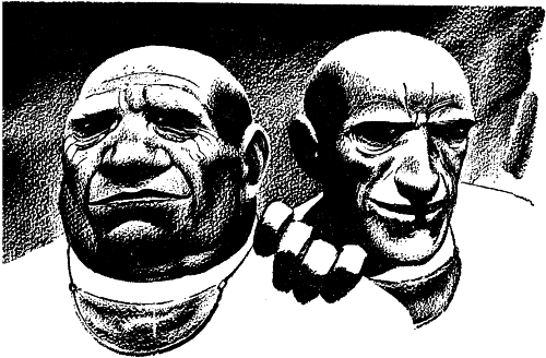 There were fourteen of them. They all wore ankle-length gowns, and they all had shaven heads. The one in the lead carried a staff and wore a pale green gown; he was apparently a herald. Behind him came two in white gowns, their empty hands folded on their breasts; one was a huge bulk of obesity with a bulging brow, protuberant eyes and a pursey little mouth, and the other was thin and cadaverous, with a skull-like, almost fleshless face. The ones behind, in dark green and pale blue, carried portfolios and slung sound-recorder cases. There was a metallic twinkle at each throat; as they approached, he could see that they all wore large silver gorgets. They came to a halt twenty feet from the desk. The herald raised his staff.