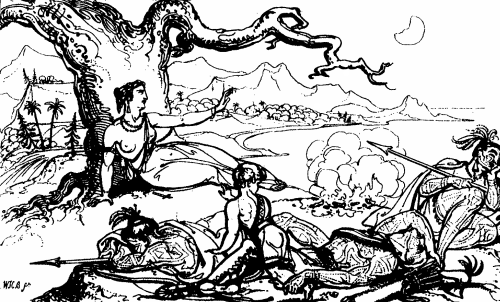 Fond and long continued were the caresses of the Eleventh Man and the Squaw-Snake, and luckily they were not interrupted by the old man, who, unlike many husbands I have known, contrived to sleep just as long as they wished he should. Before he awaked, it had been agreed between them that the death of the old man should be accomplished. So she bade him dip in the poison of her sting the points of two arrows, both intended to be put to a good use. He did so, and then retired within the fortification. Drawing his bow to his ear, and pointing an arrow at the head of the aged husband, he let fly with unerring skill. This done, he levelled the other arrow with the same precision at the head of the faithless wife. Wounded to death by the poisoned darts, the horrid monsters rolled down the hill in great agony, sweeping away, in their descent, all the trees upon the side to its very bottom, and amidst their contortions disgorging the heads of the Indians they had swallowed. Those heads rolled into Lake Canandaigua, where they were converted into stones, and are to be found there to this day. The Indian, as seated in his canoe he glides over the lake, frequently sees them lying on its pebbly bottom, and the larger bark of the white man is often dashed to pieces against them. So the eleven men and the ten women were freed from the serpents.