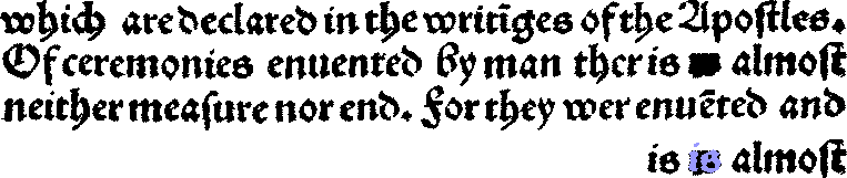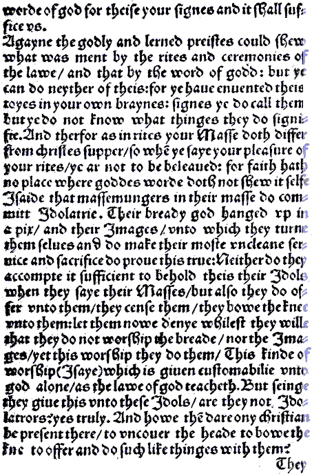 After the same maner / the prophetes in the olde tyme were conuersaunte with the Idolatrous people. || So were the Apostles famyliarlie conuersaunte with the vnbeleuinge Iues / and went also emõgest other vnbeleuing nations and men. Act. 17. S. Paule when he came to Athens / dyd not thinke skorne so famyliarlie to behaue him selfe that he went in to the temples of their Idolls / and verye curiouslie searched the corners of the same / he dyd viewe their altars / the titles and inscriptions of ther altars / so that he founde owte that title / Ignoto Deo which was an altar dedicated vnto the vnknowen God / wherof he dyd take occacion to make that same hys sermon in which he preached Christe vnto them euen as yt were owt of their own bokes.