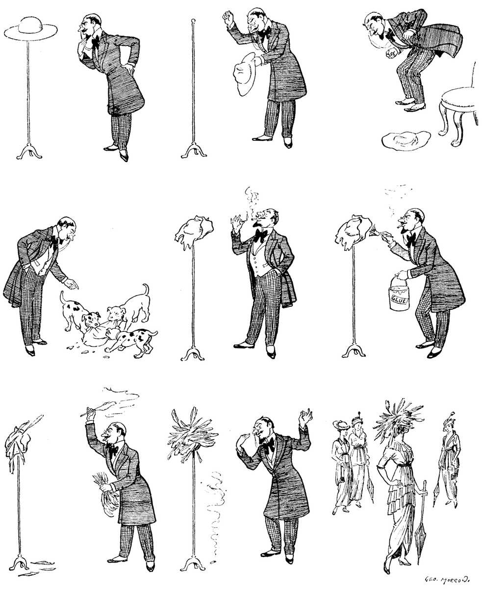 I wish I were Mr. Justus Miles Forman. Because then, if I ever chanced to wake up suddenly and find that I had been drugged in my sleep, and the six immense rubies, brought here from the East by a far-off ancestor and set in a black agate shield above my bed, to represent the "six gouttes (or drops) gules on a field sable" of my immemorial coat-of-arms, had been rudely reaved from me in the night by my cousin, who had sent one each to his six sons, I should have no fear. I should feel perfectly convinced that in a short time, by my own personal exertions, but without exercising the least particle of intelligence, I should recover those six rubies (representing six gouttes or drops gules) and replace them in the black agate shield (representing a field sable); and naturally enough, like the autobiographical hero of The Six Rubies (representing——I beg your pardon, I mean, published by Ward, Lock), I should not dream of calling in the aid of the police. Another jolly thing that would inspirit me would be the fact that each of my adventures in search of the missing jewels would conform to a separate and well-known type of magazine story: there would be one fire, one notorious cracksman, one haunted castle, one cabinet with a secret drawer, and so on. There would be plenty of excitement, plenty of hairbreadth escapes. But I think that, when collating my experiences and putting them into six-shilling form, I should delete some of the tautologous references to the past which are one of the stern necessities of serial publication. Otherwise my readers might begin to feel slightly fatigued by my six ancestral gouttes. They might even begin to feel that they did not much care if I had hereditary sciatica.