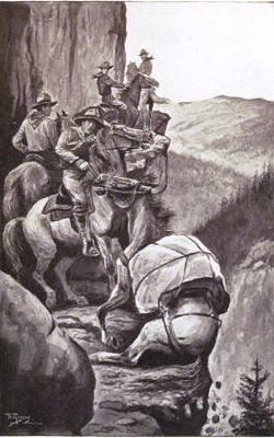 The journey down the mountainside was by no means easy, and it took the party two days to get to a point where traveling on horseback was safe. When they came down they kept their eyes open for some sign of Merwell, Haskers, and Blugg, but all they found was a portion of the latter's camping outfit and the body of one of their horses.