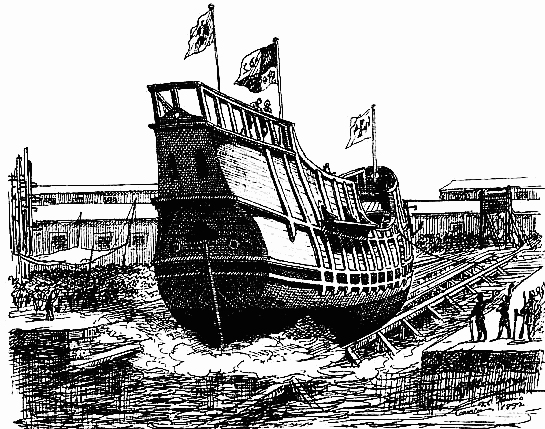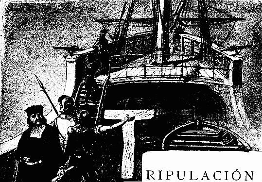 Faltaba arborlarla y aparejarla; atender exterior é interiormente al decorado, armarla con la artillería; concluir el detalle, para lo que simultáneamente se afanaban los operarios en los obradores; allá labrando tablas, acá barnizando muebles, aparte cosiendo velas, pintando escudos, acicalando lanzas, con inusitada amalgama de picapedreros que hacían balas de mármol, de herreros forjando el fanal de popa, insignia antigua de almirante; de imagineros sacando del roble ojivas, de ajustadores puliendo y graduando astrolabio y ballestilla, y á todo acudían los señores repetidos, Puente, Cardona y Monleón, mientras no llegó el momento satisfactorio de ver á la nave airosa embanderada en la bahía de Cádiz, presta para ir á Palos y dar la vela en el momento de cumplirse el aniversario centésimo cuarto en que la verdadera Santa María lo hizo.