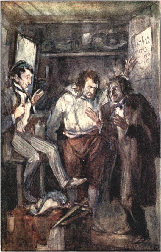Running down one week-end to Brighton to recuperate, I joined the Church Parade on the lawns. It was a sunny morning in early November, and I admired the three great even stretches of grass, sea, and sky, making up a picture that was unspoiled even by the stuccoed boarding-houses. The parasols fluttered amid the vast crowd of promenaders like a swarm of brilliant butterflies. I noted with amusement that the Church Parade was guarded by beadles from the intrusion of the ill-dressed, and the spectacle of over-dressed Jews paradoxically partaking in it reminded me of the object of my search. In vain my eye roved among these; their figures were strangely lacking in the dignity and beauty which I had found among the poorest. Suddenly I came upon a sight that made my heart leap. There, squatting oddly enough on the pavement-curb of a street opposite the lawns, sat a frowsy, gaberdined Jew. Vividly set between the tiny green cockle-shell hat on his head and the long uncombed black beard was the face of my desire. The head was bowed towards the earth; it did not even [6]turn towards the gay crowd, as if the mere spectacle was beadle-barred. I was about to accost this strange creature who sat there so immovably, when a venerable Royal Academician who resides at Hove came towards me with hearty hand outstretched, and bore me along in the stream of his conversation and geniality. I looked back yearningly; it was as if the Academy was dragging me away from true Art.