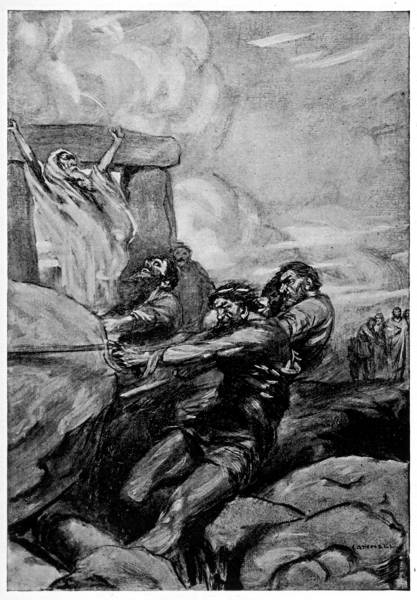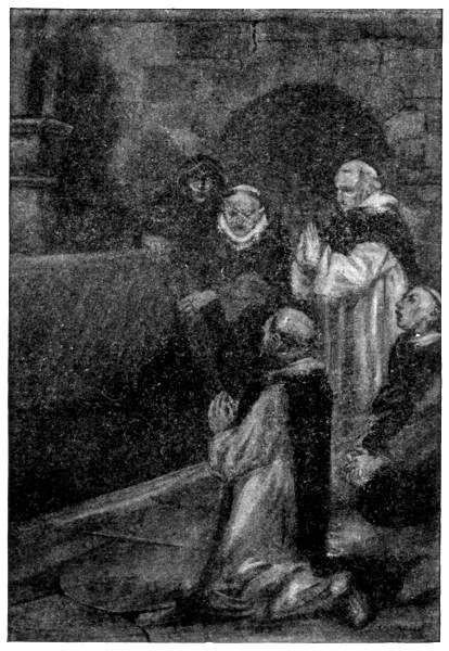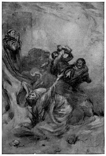 As the keel of his galley grated on the beach the Saint beheld a man on the shore seated at the door of a miserable hut, who endeavoured to attract his attention by signs. Samson approached the shore-dweller, who took him by the hand and, leading him into the wretched dwelling, showed him his wife and daughter, stricken with sickness. Samson relieved their pain, and the husband and father, who, despite his humble appearance, was chief of the neighbouring territory, gave him a grant of land hard by. Here, close to the celebrated menhir of Dol, he and his monks built their cells. Soon a chapel rose near the ancient seat of pagan worship—in later days the site of a great cathedral.