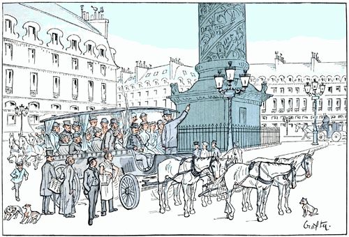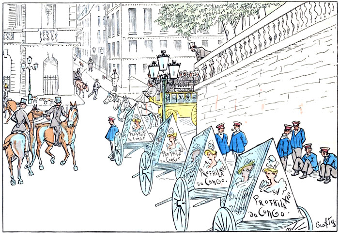 Il est midi. C'est l'heure des déjeuners, et, comme la Réclame sait que ventre affamé n'a pas plus d'yeux que d'oreilles, elle se repose. Les véhicules enluminés stationnent alignés au bas des trottoirs, pendant que leurs attelages étirent leurs membres fatigués et allument la réconfortante cigarette.—Pour être immobiles, ces véhicules n'en conservent pas moins leur aspect hétéroclite pour tous, terrifiant pour les quadrupèdes, et comme leur station quotidienne coïncide avec la rentrée des manèges, elle met au désespoir les écuyers chargés de veiller sur les premiers pas des jeunes amazones, dont les montures consternées manifestent de diverses manières leur invincible répugnance.