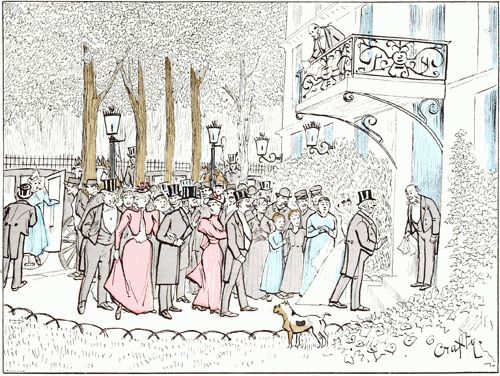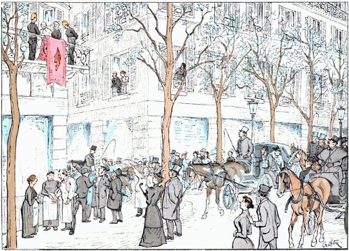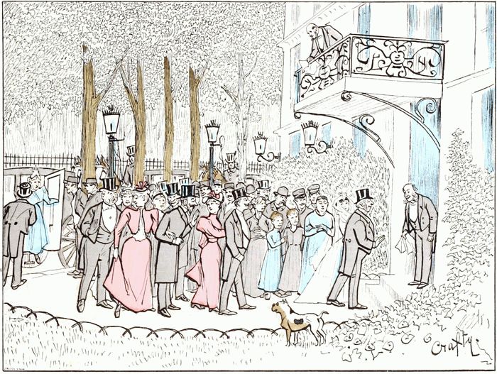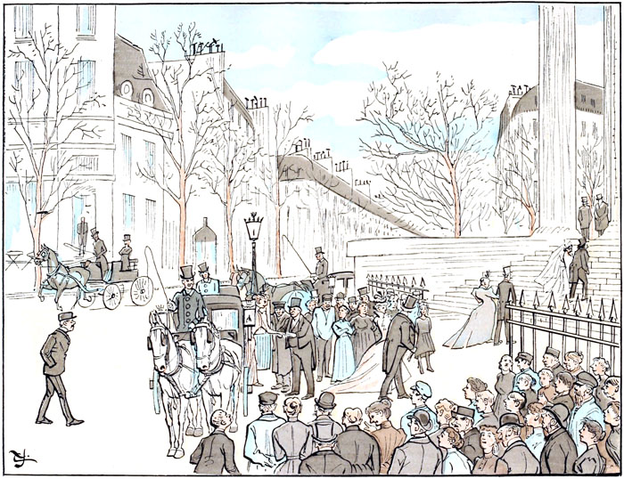 La foule est généralement sympathique aux mariages. L'heure à laquelle ils s'accomplissent coïncide généralement avec celle du déjeuner des modistes et autres couturières du quartier, que leur manque de dot maintient à l'état de célibataires sans leur enlever le désir et l'espérance de monter en grade. Elles constituent le fonds des spectateurs, et leurs connaissances spéciales leur permettent d'estimer avec exactitude les ressources probables des nouveaux conjoints et de leur entourage.