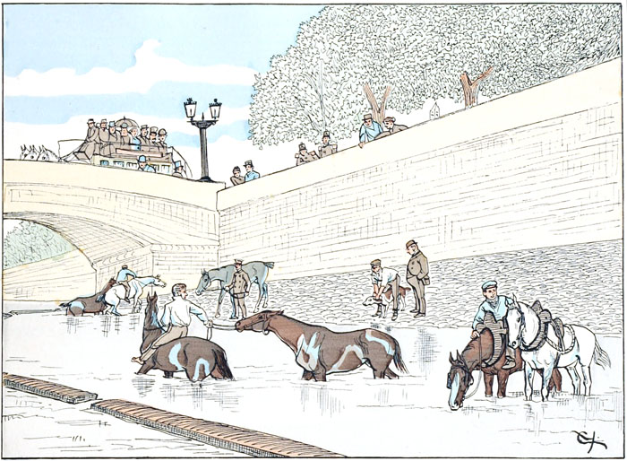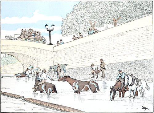 On y conduit peu de chevaux dans le seul but de les désaltérer, mais le nombre des jarrets fatigués qu'on espère raffermir par le séjour dans l'eau froide est assez considérable pour que l'abreuvoir soit suffisamment peuplé, et l'espoir de voir tomber à l'eau quelque palefrenier maladroit maintient sur les parapets une certaine quantité d'amateurs de spectacles gratuits.