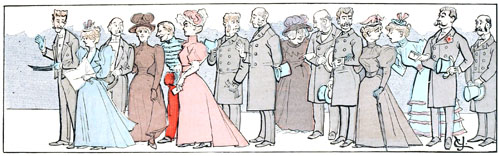 L'esquif touche au ponton, et l'employé qui préside au contrôle de ces omnibus aquatiques se prépare à donner le signal du départ. Cependant toute une famille échelonnée sur le quai se hâte lourdement,—le père est déjà sur le ponton et encourage les siens de la voix et du geste,—la fille atteint la passerelle, mais la mère à bout de souffle est encore sur la terre ferme, et ses chances d'embarquement paraissent singulièrement compromises.
