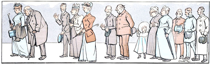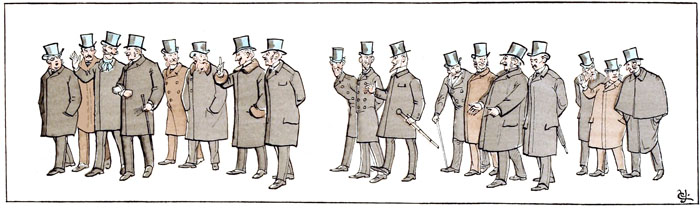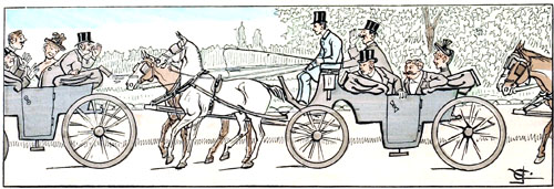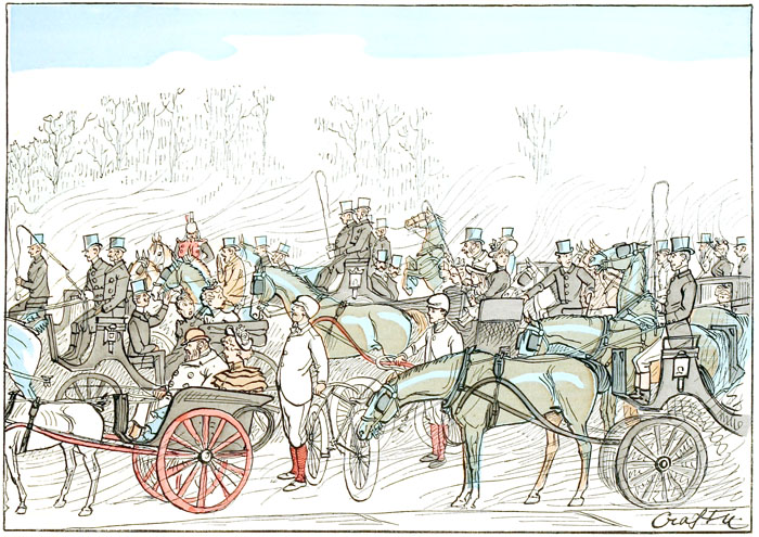 C'est toujours au moment où le défilé des voitures est le plus actif, où les chevaux sont le plus animés, que l'autorité spéciale intervient et exige qu'on les arrête pour laisser passer le public de la Pelouse. Si les chevaux s'impatientent de façon à rendre la station inquiétante, s'ils pointent au point de faire craindre qu'ils se renversent sur les genoux de leurs conducteurs, on peut être sûr que ladite autorité abusera de son pouvoir discrétionnaire pour faire défiler une nouvelle escouade de piétons.