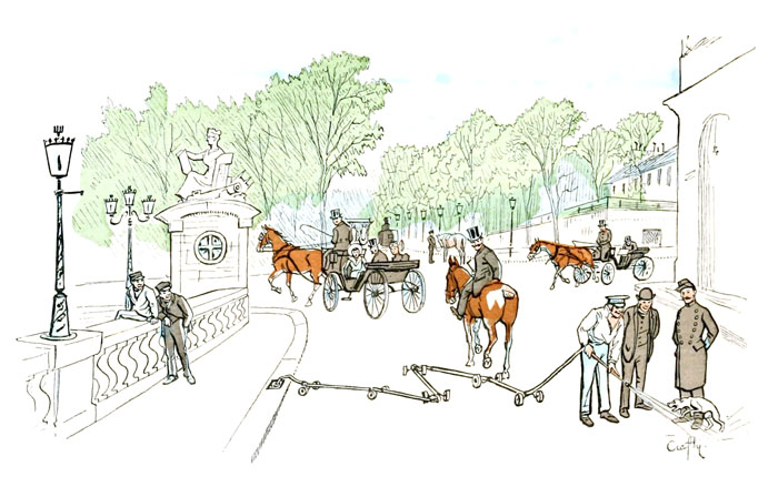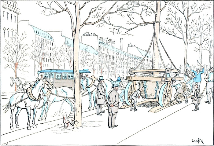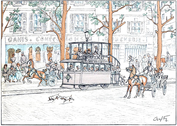A peine les chevaux commençaient à s'habituer aux tramways à vapeur, à leur fumée et à leurs sifflets, qu'on a jugé à propos d'employer l'électricité.—C'était sans doute dans une bonne intention, puisque ces nouveaux véhicules circulent sans bruit et sans fumée. N'empêche qu'ils causent à la cavalerie parisienne une terreur invincible.—Les animaux, qui ne sont qu'à moitié bêtes, se méfient toujours de ce qu'ils ne s'expliquent pas, et la vue de cette voiture que rien d'apparent ne met en mouvement, et qui remue cependant, leur inspire une méfiance qui ne me paraît pas complètement inintelligente.