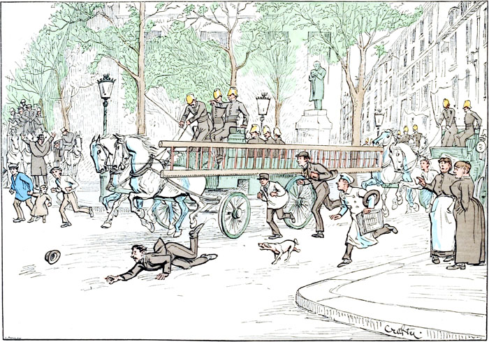 Un portier impressionnable a vu de la fumée dans son escalier.—Dans son zèle, il est allé casser les vitres de tous les avertisseurs du quartier, et de tous les points de l'horizon les pompiers accourent sur le lieu du sinistre, un peu incertains de sa situation exacte. Tous les gamins rencontrés au passage les escortent à grandes enjambées, tandis que les sergents de ville interrompent la circulation, sous le fallacieux prétexte de l'assurer.