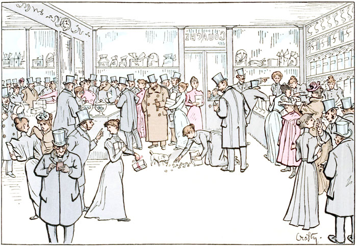 Le moment est venu d'acquitter le montant des contributions mondaines.—Les gens prévoyants n'ont pas attendu le 1er janvier pour expédier leurs étrennes, mais les retardataires qui ont attendu jusqu'au dernier moment s'empilent chez le confiseur et se bousculent pour obtenir le sac obligatoire. Le fâcheux est qu'en ces moments extrêmes les approvisionnements des spécialistes en renom sont souvent épuisés, et que pour satisfaire «aux exigences du public», ils se trouvent parfois dans la nécessité de substituer à leurs produits habituels les bonbons vénéneux et les chocolats frelatés de l'épicier le plus proche.—«Tarde venientibus ossa», a dit le poète lors de jours de l'an oubliés.