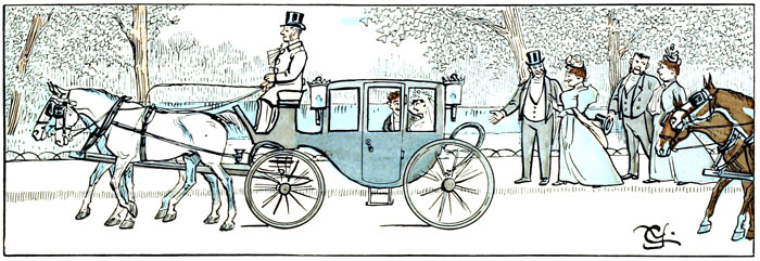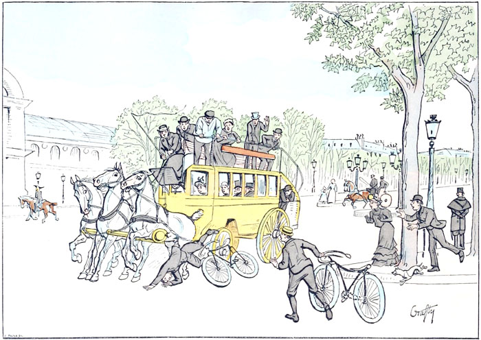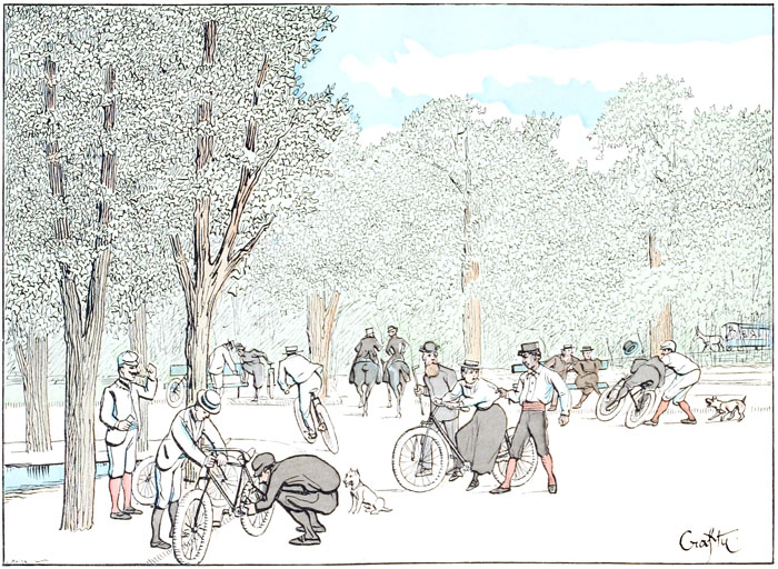 Toute aux bicyclettes.—L'accumulation de ces mécaniques donne à l'élégant carrefour l'aspect d'une gare de marchandises ou d'une exposition de machines agricoles,—les gens qui viennent en voiture en ont tout un chargement, et les cavaliers qui persistent à monter à cheval font aux gens qui sont «dans le train» l'effet de maniaques qui s'obstineraient à refuser de monter en sleeping et voyageraient en chaises de poste.