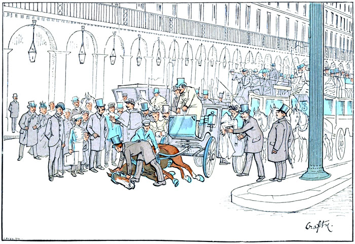 Le pavé de bois est parfois glissant,—c'est souvent le résultat de l'humidité naturelle;—plus fréquemment encore, cet état dangereux des chaussées provient d'un arrosage insuffisant qui n'enlève aucune des ordures sur lesquelles patinent les chevaux.—Ces jours-là, on compte autant d'animaux couchés que debout, et, sans l'esprit de fraternité qui porte nos concitoyens à s'entr'aider, la circulation deviendrait décidément impraticable.