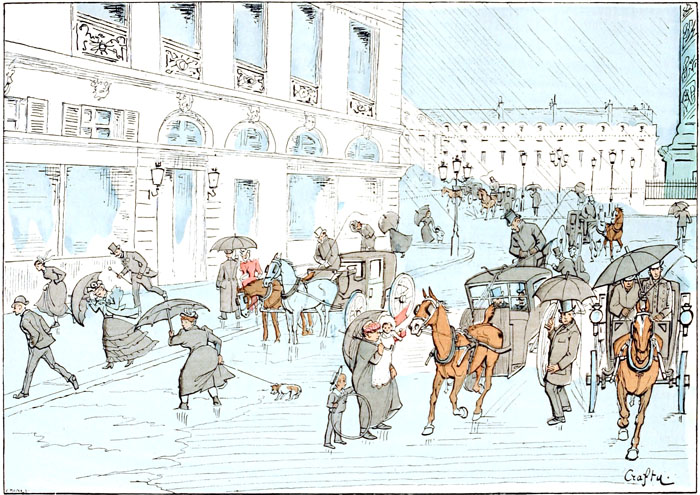 L'averse, si impatiemment attendue pendant certains étés, se multiplie parfois de telle façon que ce cataclysme devient l'événement quotidien.—Malgré cette régularité, le phénomène varie tellement les heures de son apparition, et se produit avec une telle instantanéité, qu'il parvient chaque fois à surprendre et à inonder un nombre satisfaisant de promeneurs, qui avaient cru pouvoir profiter d'une fallacieuse éclaircie.