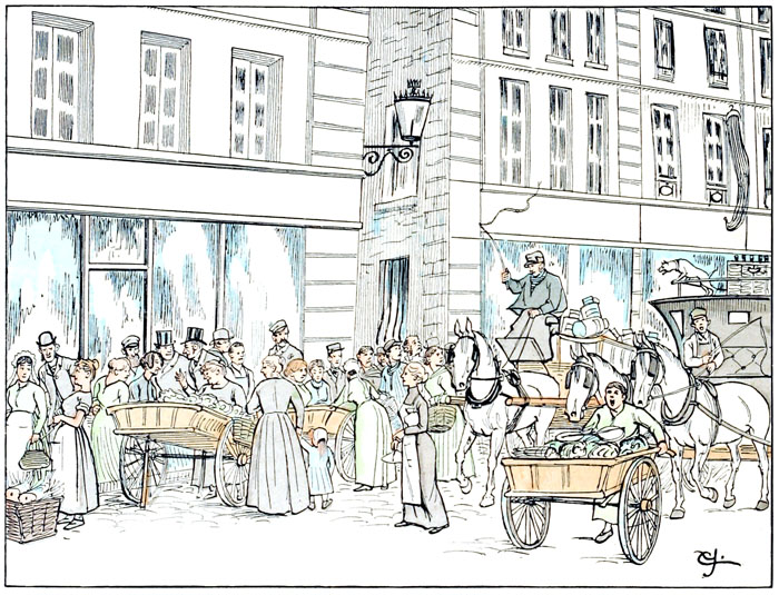 Très sympathiques aux ménagères du quartier qui les soutiennent envers et contre tous, ils sont les maîtres de la chaussée, et les plus lourds véhicules sont obligés de leur céder le pas.—Si un malheureux cocher a l'audace de marcher au plus petit trot, ou la maladresse de passer trop près d'un client installé au bon milieu de la rue, il est en proie à un vocabulaire qui révèle le voisinage des halles.