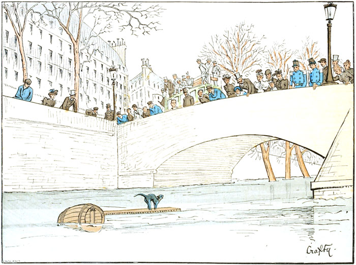 Une crue un peu forte s'est produite pendant la nuit, et le fleuve a recueilli un certain nombre d'objets imprudemment déposés trop près de ses rives, poutres, futailles vides, et autres matériaux susceptibles de flotter. Sur une de ces épaves un chat miaule déplorablement, et tous les cœurs sensibles, affiliés ou non à la Société protectrice des animaux, se demandent avec angoisse quel courageux sauveteur se portera au secours de l'infortuné félin.
