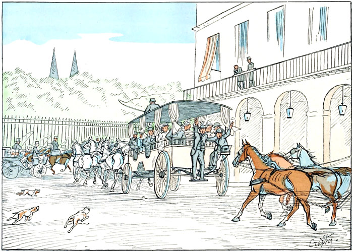 Depuis la porte du pesage de Longchamps jusqu'au sommet de l'avenue du Bois, c'est partout la même accumulation de voitures, de chevaux et de bicyclettes. Les files se suivent sans interruption, le nez des chevaux touchant la capote de la voiture précédente et les timons menaçant les derrières des valets de pied assis à l'arrière des phaétons. Malgré l'impatience de quelques-uns, la résignation générale fait que, dans un temps relativement court, cette masse de spectateurs finit par s'écouler, ce qui, tout d'abord, paraissait être absolument invraisemblable.