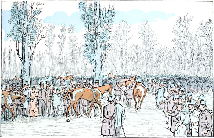C'est le rendez-vous des connaisseurs ou soi-disant tels. On examine chacun des concurrents, et, d'après son aspect, on se décide à parier pour lui ou à attendre une meilleure occasion. Généralement cet examen, forcément superficiel, n'apprend rien aux spectateurs, mais la plupart d'entre eux demeurent convaincus qu'il est essentiel pour la sage confection de leurs paris.