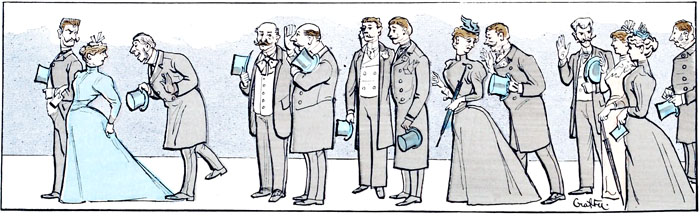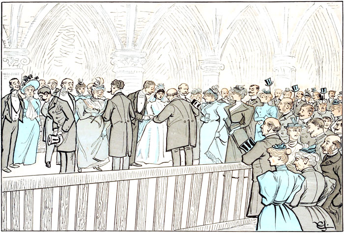 C'est le moment où les compliments s'accumulent.—Si la moitié des éloges qui se décernent à cette minute étaient mérités, il n'y aurait que d'heureuses unions. Malheureusement ces dithyrambes ne sont pas toujours sincères, et c'est ce qui explique que les tribunaux accordent quelquefois le divorce à des gens qui ne sont pas parvenus à s'entendre.