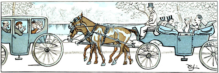 On revient du Bois comme chaque jour à la queue leu leu... Tout à coup, sans qu'on sache quelle mouche l'a piqué, un des chevaux du cortège a subitement pris une allure désordonnée que les efforts combinés de son cocher et de son camarade de timon ne sont pas parvenus à modérer. Il ne galope pas, il vole, semant la crainte dans les âmes timorées, excitant les plus nobles velléités de dévouement chez les natures généreuses. Le sentiment général est l'effroi de ce qui va résulter.—Seuls quelques sceptiques demeurent imperturbables; tous les autres spectateurs sont courbés comme autant de points d'interrogation???.....
