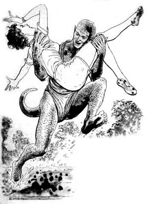 "What I should like to know," Professor Bernardi said, gazing pensively after the lizard-man as he bore the shrieking form of Miss Anspacher off in his scaly arms, "is whether he is planning to eat her or make love to her. Because, in the latter instance, I'm not sure we should interfere. It may be her only chance."