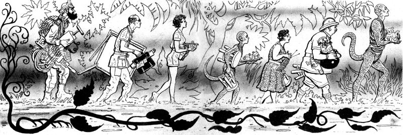 For one thing, the people from Earth were standing uncomfortably in the slippery mud, while the lizard-man was using his tail much in the fashion of a spectator stool, leaning back against it almost in a sitting position, with his armor-shod feet supporting him comfortably. For another, the tail undoubtedly served for balance and the added push of a walking stick and perhaps for swift attack or getaway. Very practical and attractive, the professor concluded—too bad Man had relinquished his tail when climbing down from the trees.