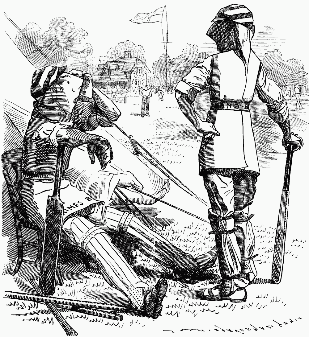 Scene—The Cricket Field. The Bell has rung for the Second Innings. Mr. Land Bill is just going to the wickets, and pauses to exchange a word or two with Mr. Crimes Bill, who has had so long an innings in the earlier part of the match.
