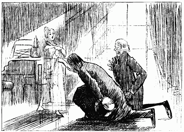 Scene—Portion of a Stationer's Shop, used as Post Office. Two Young Ladies (let them be distinguished as Miss Cross and Miss Orty) discovered behind wire-screen. At opening of scene, the public is composed exclusively of the gentler sex, and the demeanour of Miss C. and Miss O. though firm, is not positively forbidding. Lady Customers, having despatched their business move away, leaving the coast clear to three Mild Men, who advance to screen with a meekness designed to propitiate. Instant transformation in both Miss C. and Miss O., who gaze at them through screen with air of visitors at the Zoo who are not fond of animals.