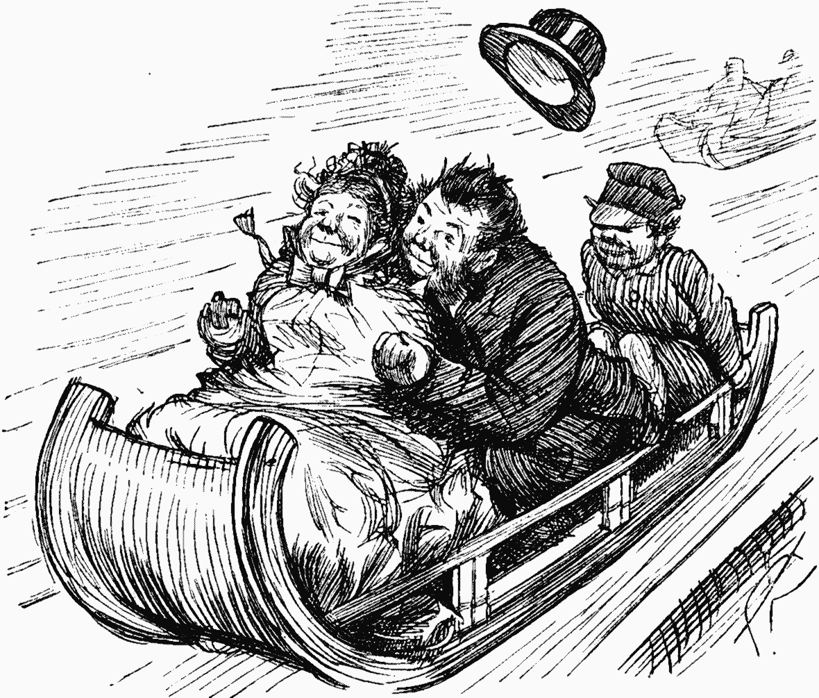 Curiosity, which is the Waiter's weekness, makes me inquire, why so many Cow Boys when there aint not no Cows? We wound up with a Bufferlow hunt, but as the animals was jest as uncurry-combed and as dirty as afore, I gammoned Mrs. Robert, who was with me, that it was ardly a site for a reel dellycat lady to witness, so we went off to see the Toboggening, and grate fun it was to look at. But, to my extreme estonishment nothink wood do but Mrs. Robert must try it, and, in spite of all my remonstrances, I presently found myself a seated with my bitter arf on the top of an high hill, about to be launched hedlong on our wild career with ony a piece of rope to guide us and nothink to stop us. Oh, that dedly moment of hezitashun! and then the rush through the hair with sitch litening speed as made Mrs. Robert give jest a little squeal. How any sane person having wunce tried this new game, which recalled to fond memory the sensashun of my fust swing, can wish to repeat the dose, I carnt understand. He suttenly ought to have the stummuck of a Horsestrich rather than of a Halderman. The fond partner of my fate having a little hedake after her rash xperryment, which she insisted upon declaring was owing to the rifle-shooting, I adwised her to leave the noisy scene and seek the cumfort of her quiet home, promising to jine her hurly, so she went. I was afterwards asked to try the Switch-back Railway, but learning from a prewious wictim as how the sensation reminded him of the fust time as he crossed the Channel, I declined with thanks.