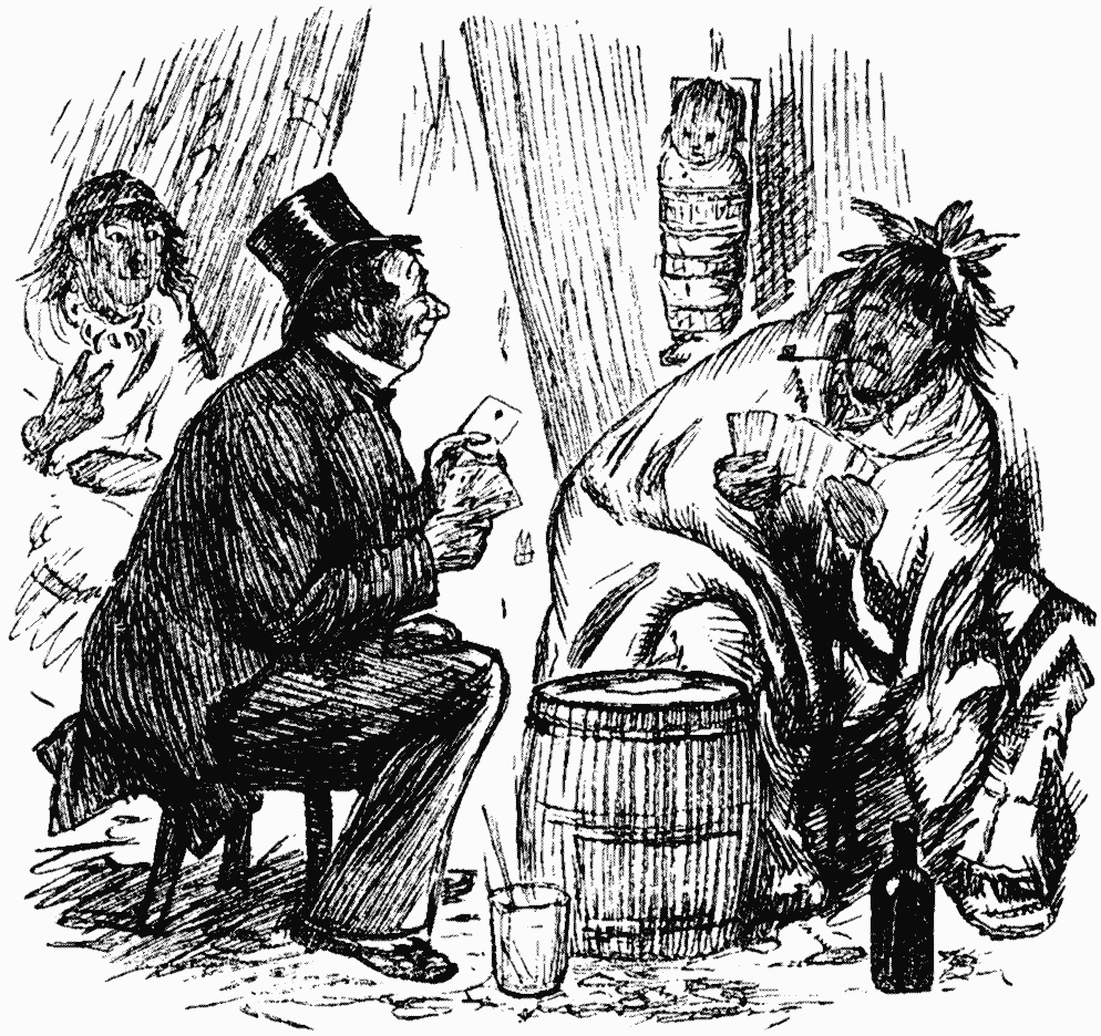 I spent a werry plessent evening with the principle performers such as Red Shirt, and Cut Meat, and sum others, and whenever the conwersashun flagged I surgested a adjurnment to the Amerrycan Bar, and we allus tried a new drink, and this I will say for my forren frends that they took them all with the same coolness as if they had been the native drinks of the Far West End. The larst one we tried was called "A Yard of flannel," and for warmth and cumfort it was well-named, but somehows I fancy it must ha bin rayther a staggerer, for I remember werry little of what took place afterwards. But I have sum dim recklekshun of playing at cards with two Chiefs and a Squaw, and that one of them had a dress on sumthink like a porky-pine with his squills, and that I lost my money, and that sum familyer voice said, "Why, Robert, you've lost your Injian Rubber!" at witch we all larfed. How I got home I don't werry well remember, but I do remember, and shall probberbly never forget, the werry warm recepshun I met when at length I arrived there, or the nex morning's hed hake. I don't think I shall try "a yard of flannel," again in an hurry.
