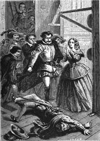 Cuando le dijeron cómo había vivido seis años; que su mujer le había robado y abandonado; que su hija había desaparecido con el paje Cristóbal Cuero; que vivía de la caridad del duque de Osuna, Montiño fué lentamente desplomándose; cuando, por último, le contaron que nombraba continuamente á Dorotea, un grito horroroso, un rugido terrible salió del pecho del desdichado, y cayó sobre el lecho acometido de un vértigo mortal.