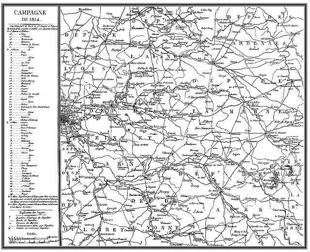 Pyrénéess (armée des). Voyez Dalmatie (le duc de). Raguse (le maréchal Marmont, duc de), se retire sur Metz, 26; sur Verdun, 45; sur Saint-Mihiel et Vitry, 87.--Combat à Brienne, 100; et le lendemain à Rosnay, 102.--Marche sur Champaubert, 116.--Poursuit Blücher sur Châlons, ibid.--Recule sur Montmirail, 122.--Combat à Vauchamps et poursuit de nouveau Blücher sur Châlons, 123.--Recule sur Sezanne et La Ferté-Gaucher, ensuite sur Meaux, 167.--Arrête les Prussiens à Lisy-sur-Ourcq, 170.--Forme l'aile gauche du cercle qui pousse Blücher sur Soissons, 173.--Arrive devant Laon par Corbeny, 188.--Est mis en déroute dans la nuit du 9 au 10 mars, 190.--Rallie son monde à Béry-au-Bac et vient prendre part au combat de Reims, 193.--Reste à Reims pour contenir Blücher, 201.--Recule sur Château-Thierry, 217.--Vient donner dans la grande armée des alliés à Fère-Champenoise, 221.--Se retire sur Paris et combat sous les murs de Paris, 231.--Il est autorisé à négocier la capitulation de Paris, 232.--Se retire par la route de Fontainebleau et prend position derrière la rivière d'Essone, 356.--Envoie par un exprès à Napoléon le sénatus-consulte de la déchéance, 371.--Est désigné par Napoléon pour aller stipuler les intérêts de la famille impériale au traité de Paris, 373.--Traite avec les alliés, lève le camp d'Essone et laisse Fontainebleau à découvert, 375.--Ordre du jour de Fontainebleau, par lequel Napoléon annonce à l'armée la défection du duc de Raguse, ibid.
