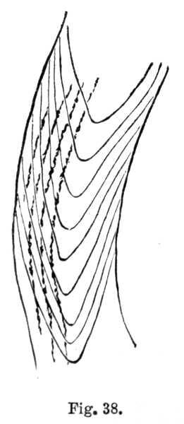 Fossil shells are found in these slate-rocks. I have here several specimens of such shells, occupying various positions with regard to the cleavage planes. They are squeezed, distorted, and crushed. In some cases a flattening of the convex shell occurs, in others the valves are pressed by a force which acted in the plane of their junction, but in all cases the distortion is such as leads to the inference that the rock which contains these shells has been subjected to enormous pressure in a direction at right angles to the planes of cleavage; the shells are all flattened and spread out upon these planes. I hold in my hand a fossil trilobite of normal proportions. Here is a series of fossils of the same creature which have suffered distortion. Some have lain across, some along, and some oblique to the cleavage of the slate in which they are found; in all cases the nature of the distortion is such as required for its production a compressing force acting at right angles to the planes of cleavage. As the creatures lay in the mud in the manner indicated, the jaws of a gigantic vice appear to have closed upon them and squeezed them into the shape you see. As further evidence of the exertion of [Pg 433]pressure, let me introduce to your notice a case of contortion which has been adduced by Mr. Sorby. The bedding of the rock shown in this figure[E] was once horizontal; at A we have a deep layer of mud, and at m n a layer of comparatively unyielding gritty material; below that again, at B, we have another layer of the fine mud of which slates are formed. This mass cleaves along the shading lines of the diagram; but look at the shape of the intermediate bed: it is contorted into a serpentine form, and leads irresistibly to the conclusion that the mass has been pressed together at right angles to the planes of cleavage. This action can be experimentally imitated, and I have here a piece of clay in which this is done and the same result produced on a small scale. The amount of compression, indeed, might be roughly estimated by supposing this contorted bed m n to be stretched out, its length measured and compared with the distance c d; we find in this way that the yielding of the mass has been considerable.