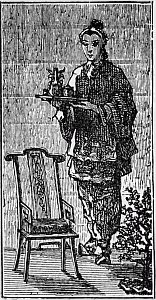 When Mr. and Mrs. Graham went to one of these dinners, knives and forks were borrowed for them, and the other English visitors, in place of chop-sticks. A china spoon and a two-pronged fork were set before each person, and there were china wine-glasses. The[210] table-napkins were of brown paper. Basins of fruit, from which all helped themselves as they liked, were in the middle of the table. There were a great many soups and other courses. Every now and then the host took something out of a basin with his chop-stick, and offered to put it into the mouths of his guests. Out of politeness they were bound to accept these gifts. There was not any beef, as no Chinaman eats beef. Music was played, and slaves fanned the people during dinner.