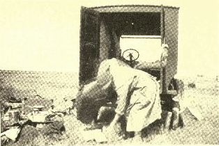 Then we came to a nightmare of a road, very steeply graded and with loose hard clods about 3 feet deep on the top. These nearly knocked the bottom out of the engine, so I had to drive on the side at an incredible angle, expecting every moment to be overturned, though my companions were steadying the van with might and main, the one hanging on to one side, and the other propping up on the other. Every now and then we had to stop and unload, or else we must have capsised. We arrived at Kindersley about 2.30 a.m., and found Mr. and Mrs. W. still waiting up for us with a splendid supper prepared, to which we did full justice. About four in the morning a tremendous thunderstorm came on. I woke up with a start and suddenly remembered that I hadn't covered up the engine, so I scurried out to do so, otherwise my sparking plugs would have been ruined and the whole of the engine flooded. The difficulty was to keep the tarpaulin on, as there was always a big wind. I made up my mind that another year the engine[85] should have a proper mackintosh cover to clip on.