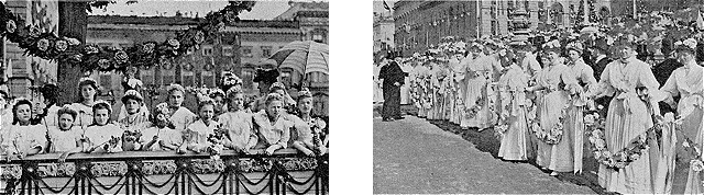 La traditionnelle Fête des Fleurs, instituée au bénéfice de la caisse des Victimes du devoir, a eu lieu, comme de coutume, au bois de Boulogne. Le vendredi 2 juin et le samedi 3, pendant deux après-midi, des équipages enguirlandés défilèrent le long de l'allée des Acacias devant une double haie de curieux intrépides bravant un soleil implacable; car un temps superbe favorisa ces journées trop souvent mouillées et ce fut là peut-être ce qu'elles offrirent de moins «déjà vu». A noter pourtant les nouvelles conquêtes de l'automobilisme dans ce domaine des élégances, où les attelages semblent désormais relégués au second plan; il y avait tant d'automobiles si ingénieusement et si luxueusement décorées qu'il fallut décerner plusieurs prix d'honneur; l'un d'eux échut à Mlle Marconnier, de l'Opéra, pour sa voiture parée fort à propos de roses rouges et jaunes (les couleurs espagnoles) et surmontée d'un petit moulin à vent tout fleuri dont un moteur invisible faisait tourner les ailes.