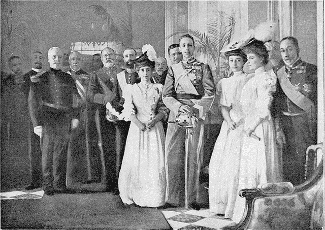 Alphonse XIII. Gén. Debatisse. M. Loubet. Duc de Santo-Mauro. M. de